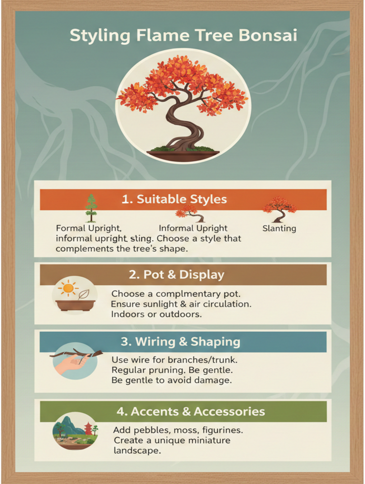 By using these styling tips, you can make a beautiful and unique flame tree bonsai that shows off the tree’s natural beauty and matches the décor in your home or garden. Remember to be patient and gentle when styling your bonsai to avoid damaging the tree and to enjoy the process of creating a beautiful work of art.
